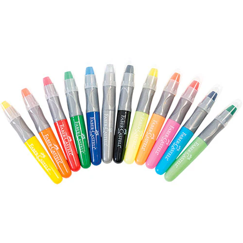 Super soft and buttery Gel Crayons come in 12 colors: red, yellow, orange, dark blue, grass green, black, silver, neon yellow, neon orange, neon pink, neon blue and neon green. Their chunky size is perfect for small hands and are great for drawing on large surfaces. Colors glide effortlessly on paper, glass and mirrors, but washes off easily. Includes sturdy plastic storage case and book with tips and techniques. Limited time offer- Get the Mini Watercolor Pad Free with your purchase. A $4.99 value. From Faber-Castell, for ages 3-10 yrs.