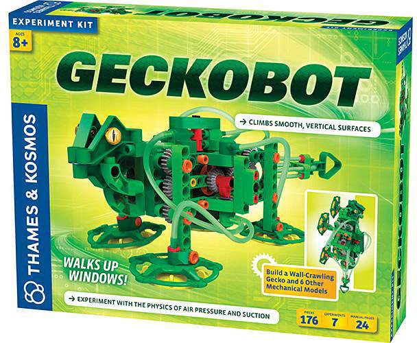 Just 1 exciting trip up, up, up the wall and you'll know why it's an award winner. An innovative battery-powered gear system moves the legs – while an air pump creates the suction that keeps it climbing. When its tongue hits an object, the motor reverses and the gecko walks back down the wall. The 24-page, color manual is full of lively information, as kids build 6 other cool models with the 176 pieces. Requires 3 AAA batteries. For ages 8-12 yrs, from Thames & Kosmos.