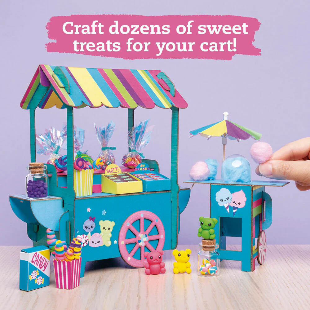 The perfect miniature scene for crafters with a sweet tooth! Dazzling candy-colored clay and puffs of pastel cotton let you re-create all sorts of confectionery, from sour gummies to rainbow ribbon candy, tie-dye jawbreakers, swizzle sticks, clouds of cotton candy, and more! Creative prompts encourage crafters to invent their own candy brands, and display them in clear glass-looking jars with stoppers, in miniature boxes, on wooden lollipop sticks, or in iridescent cellophane baggies with twist ties. Slot together the cotton candy stand with a clear dome to serve your customers, and a tented kiosk to display your assortment of sweet treats.