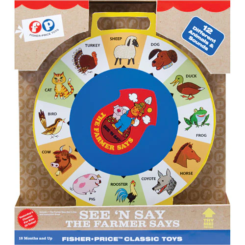 A classic from Fisher Price, introduced between 1957-1971, children learn about 12 different animals and the sounds they make. Fun, easy, compact–just right! For ages 18-36 mos